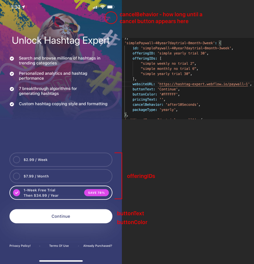 Let’s break that down a bit. Offering ID corresponds with a RevenueCat offering, which means at any time I can submit a new product to Apple, configure it on RevenueCat, and start showing it to users. Pricing text is a string that’s used to describe how the pricing is written (not shown in the above screenshot). Cancel behavior determines when the cancel button appears.