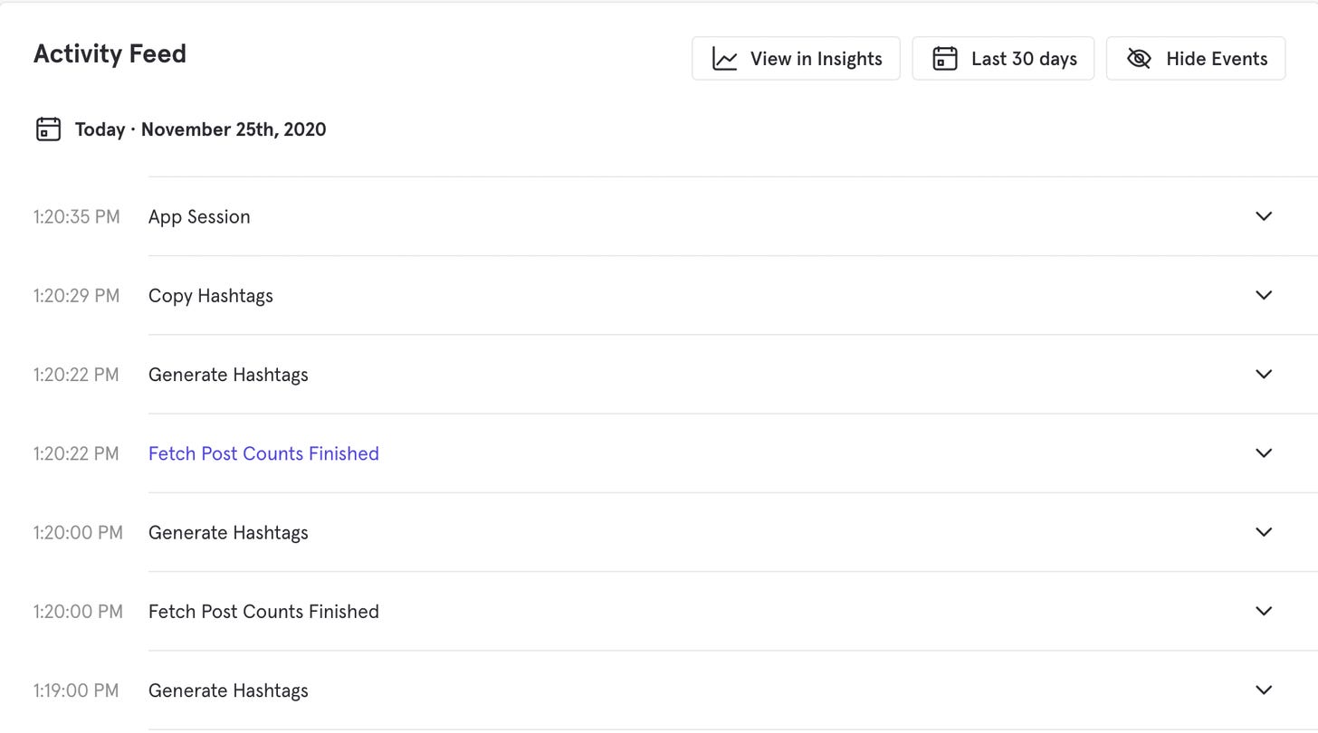 After looking at 10 to 15 users, you’ll start to notice usage trends. For example, people will typically open Hashtag Expert a few times a week, generate a group of hashtags, and copy them. Their sessions will last between one and two minutes. I’ve spoken to a handful of indy developers, and one of the most surprising things I learn is how few people have event-based analytics implemented. Hopefully, by now I’ve convinced you.
